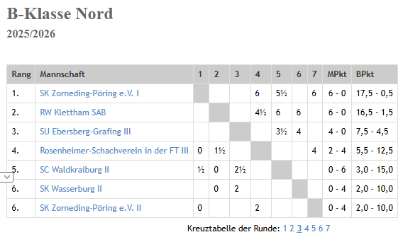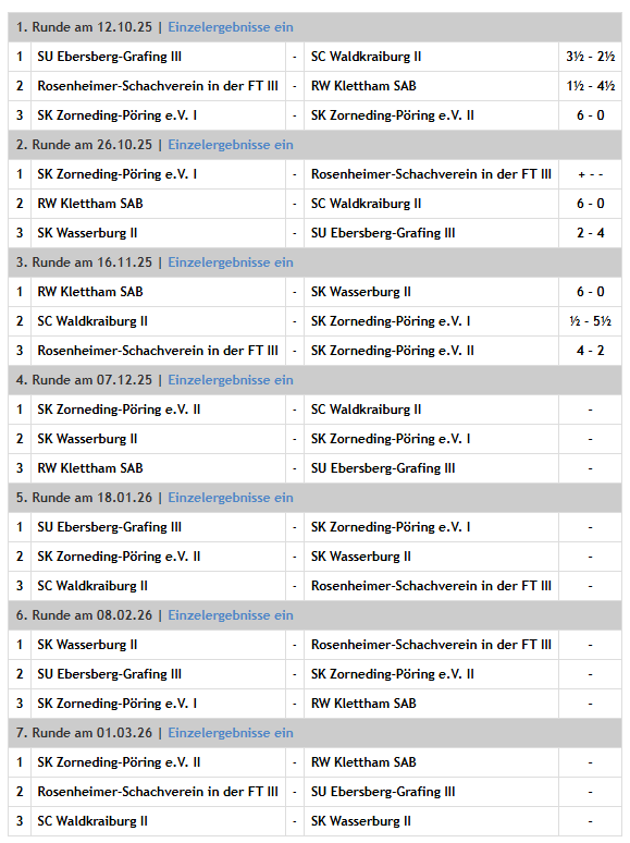 Nach den drei Runden zeichnet sich bereits klar ein Zweikampf um den Aufstieg ab: SK Zorneding-Pöring e. V. I gegen RW Klettham SAB. Die Entscheidung um den Aufstieg könnte in Runde 6 am 08.02.2026 beim direkten Aufeinandertreffen der beiden Kontrahenten in Zorneding fallen.